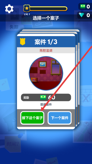 1、在案件选择界面,根据箭头的指向处点击接下这个案子按钮,承接陈胜盗洞案件开启侦探调查流程。