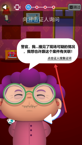 2、向目击证人询问环节,通过点击证人开始搜索证词,获取与案件关联的现场可疑情况信息。