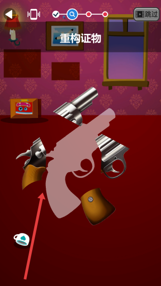 3、在重构证物阶段,拖动部件完成拼接手枪形状证物,在完成证物重构后推进案件侦破进度。