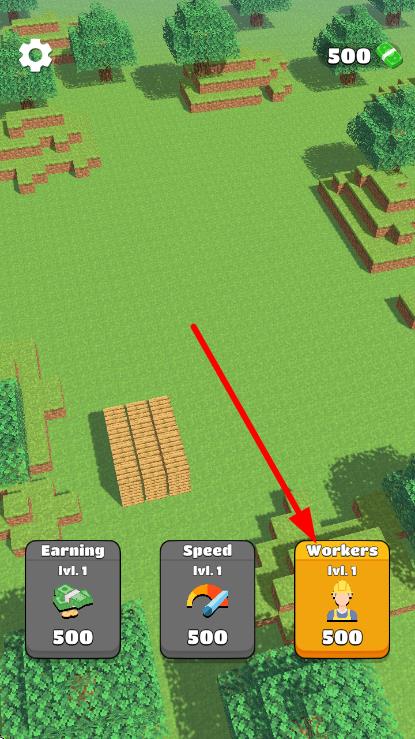 1、我们进入界面后,点击下方的按钮,消耗500资源升级工人,增加伐木作业的人力。