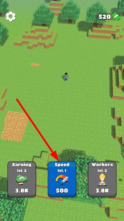3、积累资源后,点击箭头指向的按钮,消耗500资源升级速度,加快伐木作业效率,获取更多木材。