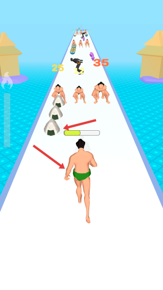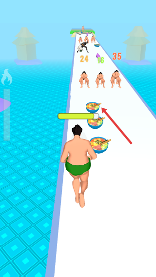 1、操控相扑角色奔跑,优先拾取饭团,增加能量,同时避开或击败路上敌人,推进关卡。