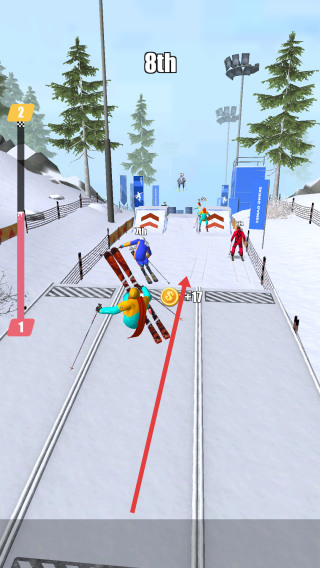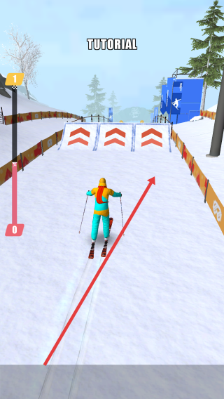 2、在滑雪赛道中,看到有箭头指示的斜坡时,可借助其获得加速或跳跃效果,滑动空白的助力在赛道上更好地前行。