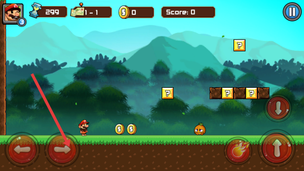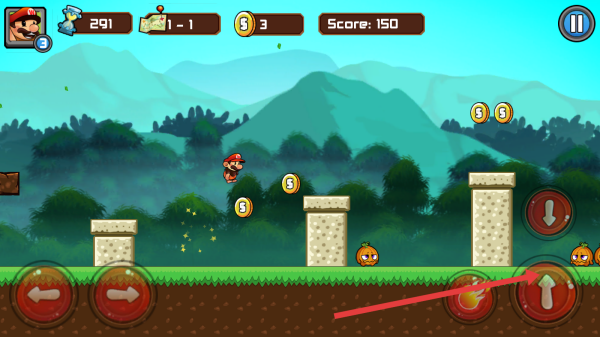 1、在进入游戏后,通过左下角的左右箭头按钮控制角色移动,在关卡场景中冒险,注意收集金币以及踩踏敌人。