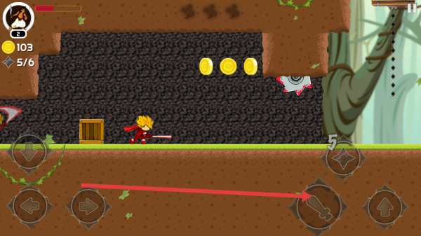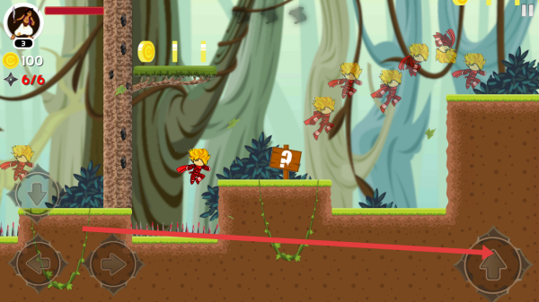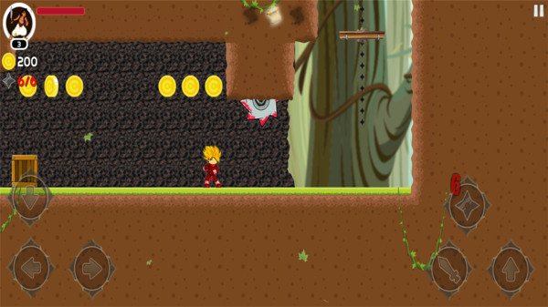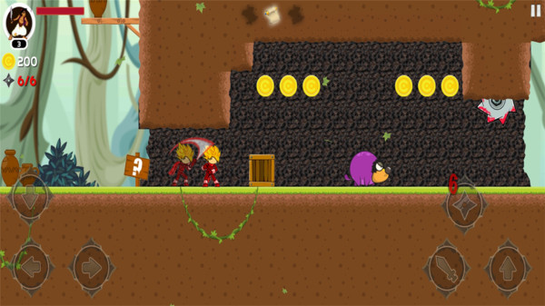 1、进入游戏后,通过左下角的方向按钮控制角色移动,在森林场景中冒险,注意躲避尖刺等危险障碍物。