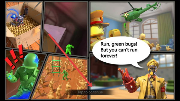 2、过场动画展示绿兵与敌人对峙情节,点击屏幕中的Tap-to-continue,推进剧情进入战斗关卡。