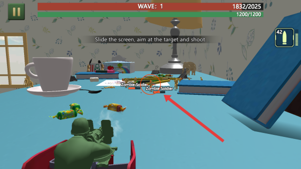 3、战斗关卡中,可以滑动屏幕瞄准Zombie-Soldier,射击抵御敌人,完成第一波WAVE:1防御。