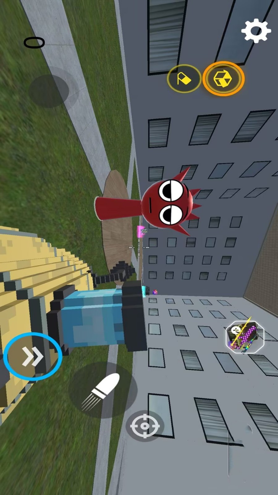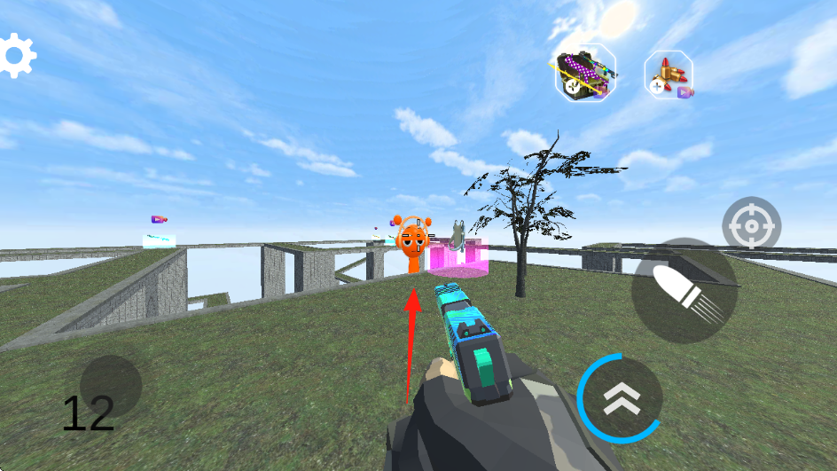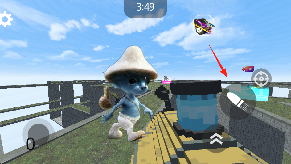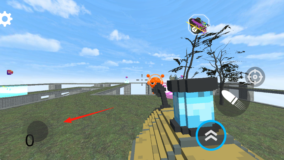 1、进入游戏,场景包含草地、桥梁、树木等户外环境,有蓝天白云的天空背景,可以点击左侧的按钮移动方向。