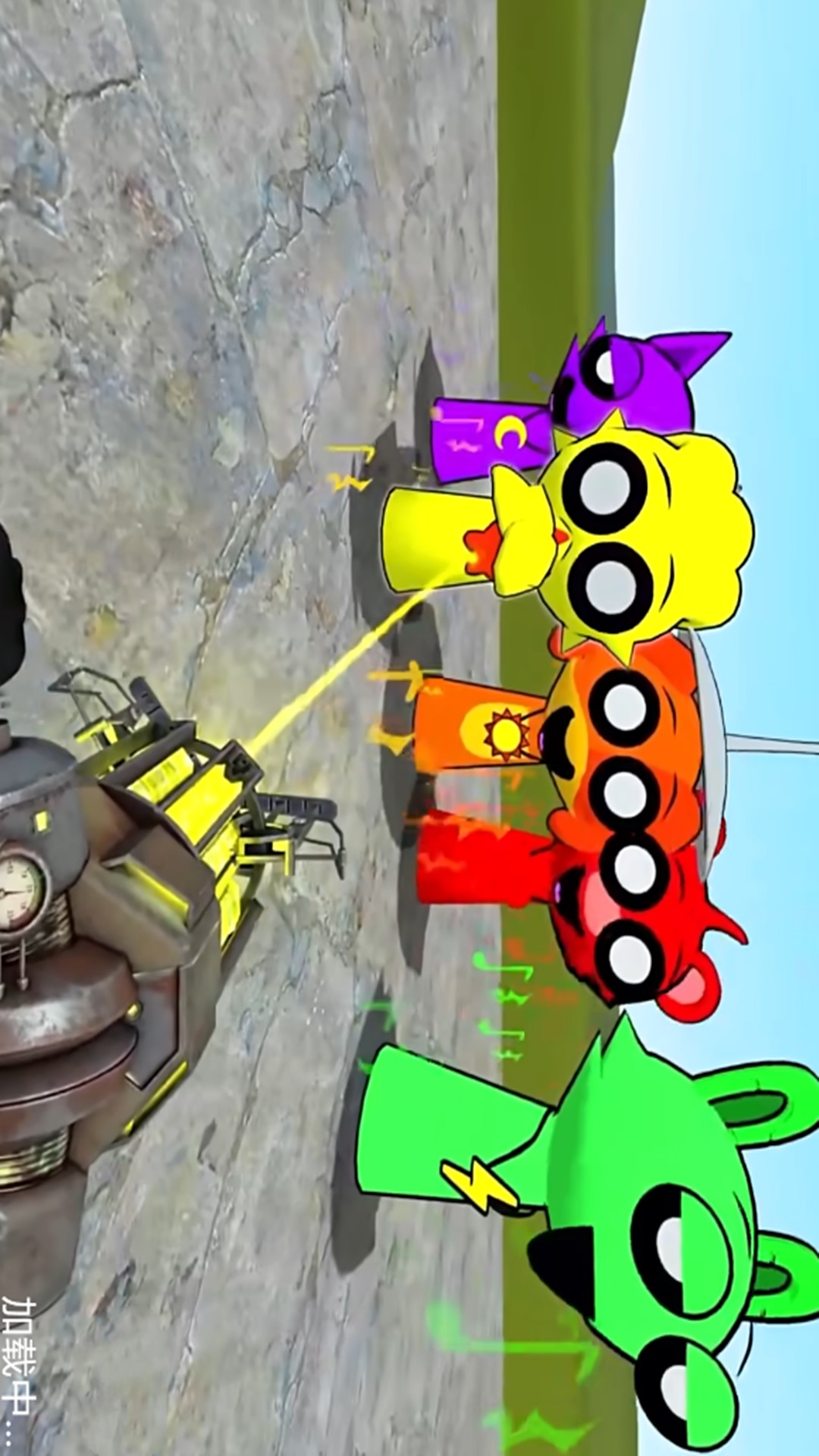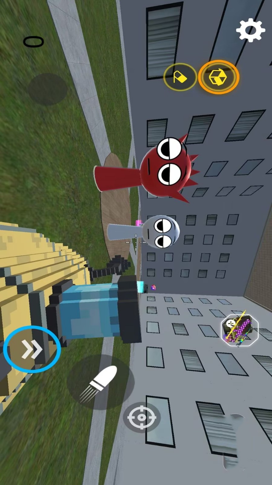 2、玩家可以在界面上操控不同的武器,敌人有橙色圆形怪物等,还出现带蘑菇帽、背着蜗牛的蓝色奇特角色。