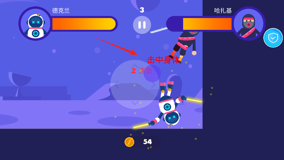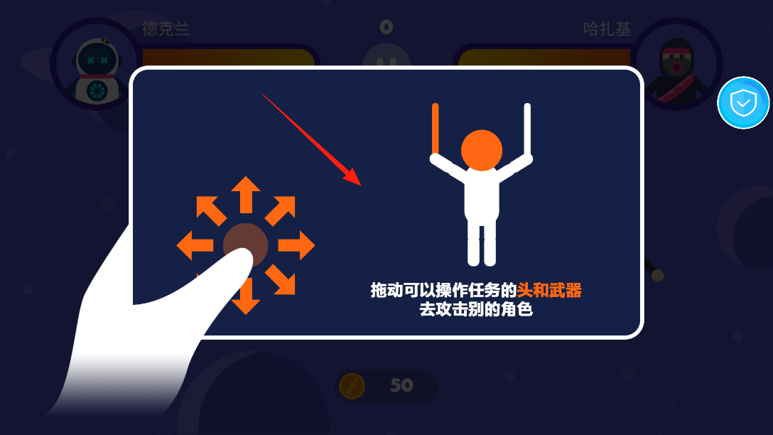 1、进入太空格斗教学界面,根据指引,拖动方向键操作角色头部与武器,通过拖动,调整攻击角度与方向,瞄准敌人,开启战斗互动,体验独特的操控战斗机制。