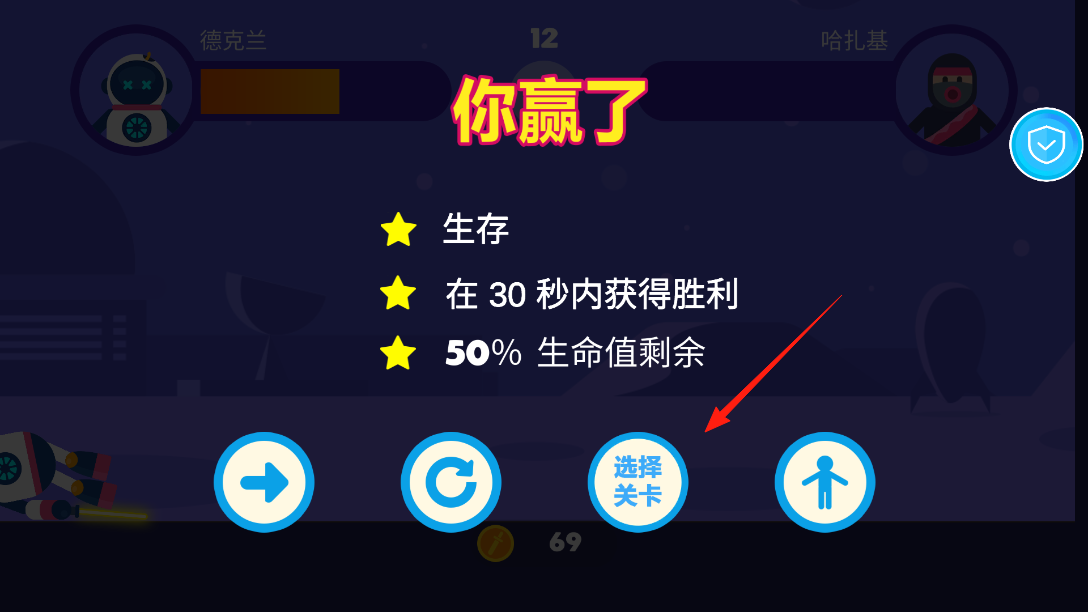 3、战斗胜利后,进入结算界面,显示生存,限时,血量等星级奖励,点击选择关卡按钮,进入关卡选择界面,挑选新关卡,继续挑战,体验关卡解锁与推进玩法。