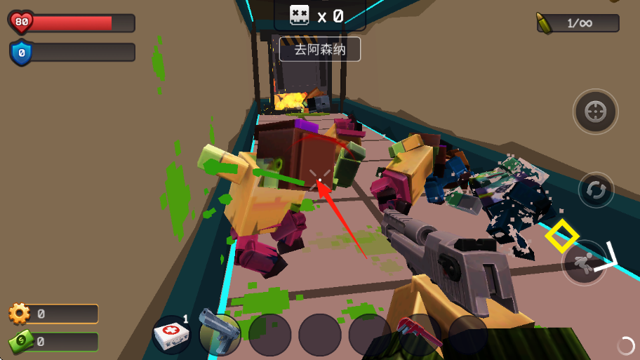 2、显示去阿森纳,角色持枪对抗彩色方块造型的僵尸,界面有血量、护盾、武器弹药及道具栏。