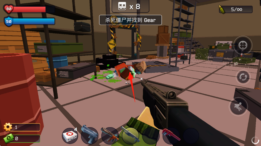 3、任务为杀死僵尸并找到Gear,角色在仓库场景,武器弹药为5/∞,有多种武器道具可选。