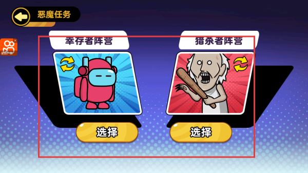 2、进入阵营选择界面,有幸存者阵营和猎杀者阵营两个选项,点击对应阵营下方的选择按钮,确定自己的游戏阵营。