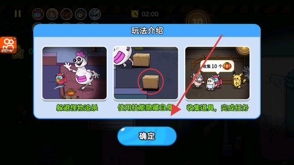 3、在玩法介绍界面,仔细阅读躲避怪物追杀、使用技能隐藏自身、收集道具,完成任务等玩法说明,然后点击确定按钮,正式开始游戏。
