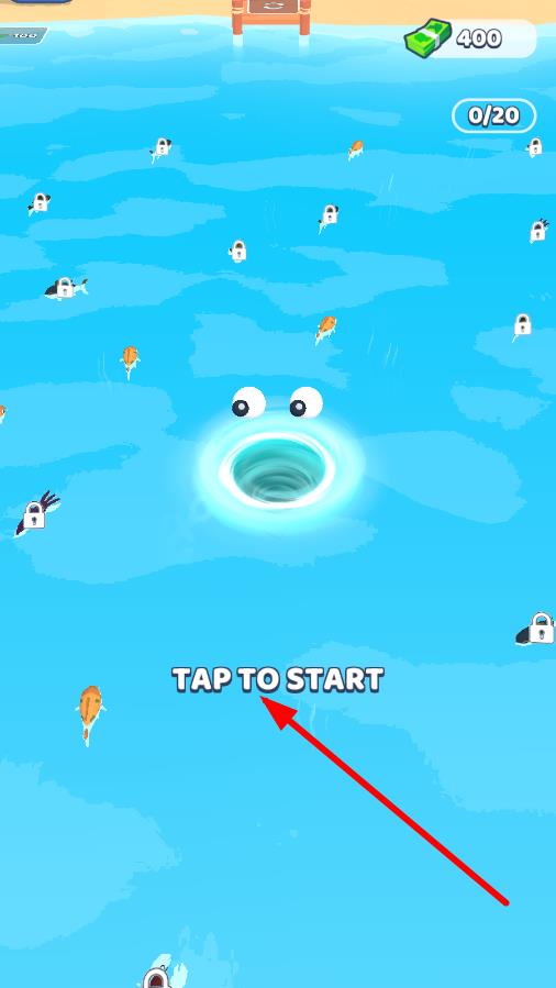 1、进入游戏主界面,点击“TAP TO START”开启游戏,操控漩涡移动,靠近鱼类即可自动吞噬,按提示完成初始钓鱼收集,积累基础资源。