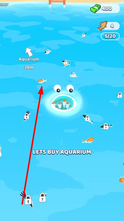 2、当满足条件时,界面出现“LETS BUY AQUARIUM”提示,操控漩涡移动至对应箭头指向的鱼类区域,消耗资源解锁水族馆,拓展玩法场景。
