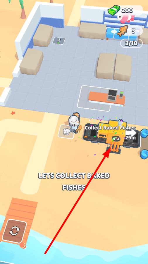 3、切换到餐厅场景,看到“LETS COLLECT BAKED FISHES”提示后,操控角色走向箭头所指的烤鱼设备,收集烤鱼用于经营,提升餐厅收益。