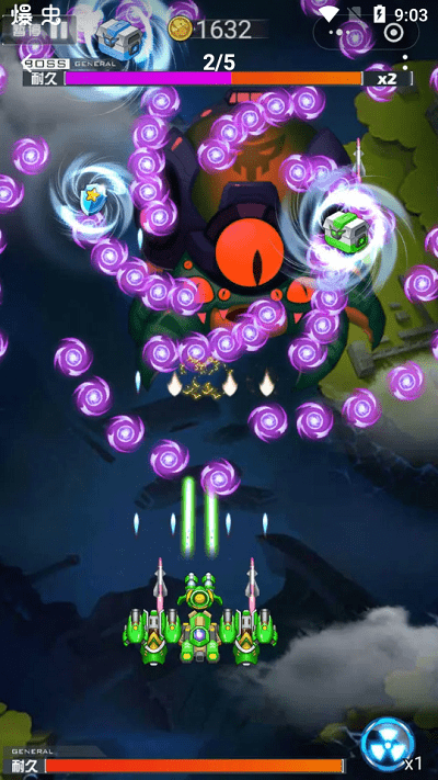 1、滑动屏幕控制战机移动,自动发射武器消灭敌人。
