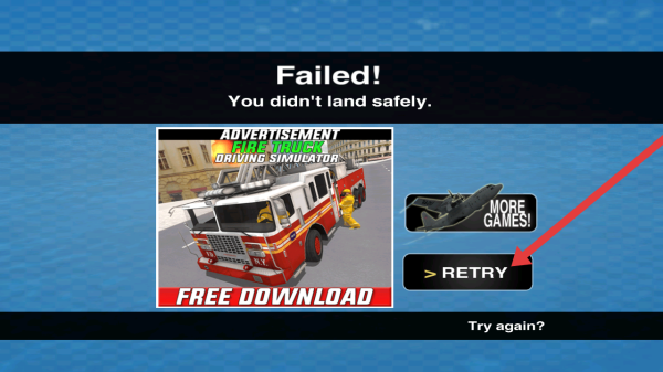 3、若降落阶段操作失误,屏幕会弹出降落失败提示,此时点击界面中的重试按钮,重新进入关卡。