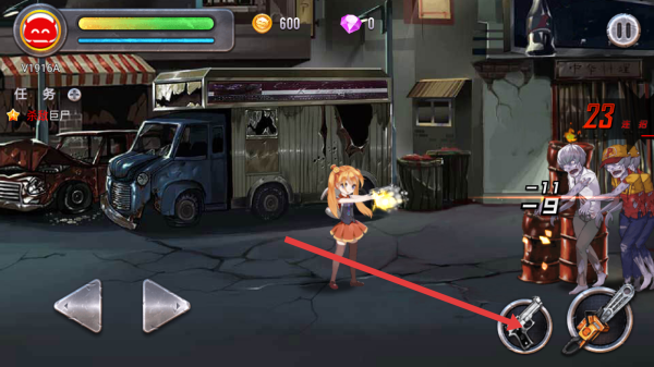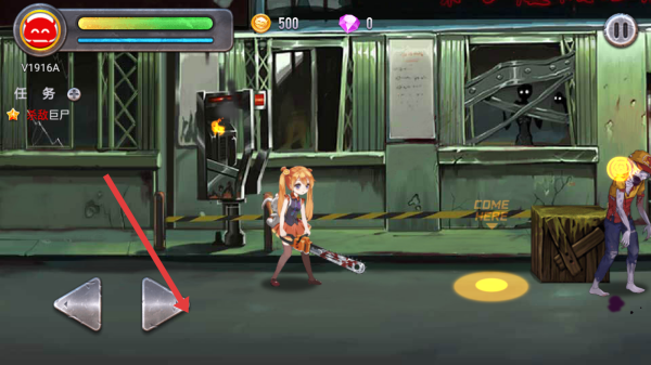 1、进入游戏后,通过左下角的左右箭头按钮控制角色移动,在城市的废墟场景中冒险,注意躲避僵尸的攻击。