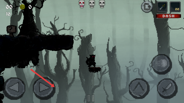 1、进入游戏后,通过左下角的左右箭头按钮控制角色移动,在森林场景中冒险,注意躲避尖刺等危险障碍物。