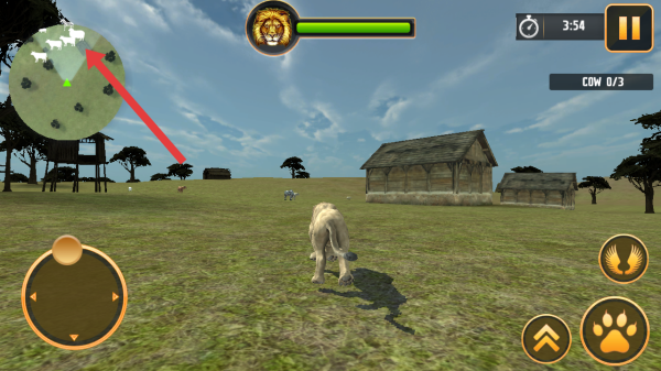 1、需要观察左上角雷达,定位任务目标COW需捕获3头,通过左侧摇杆操控狮子移动,前往目标的区域。