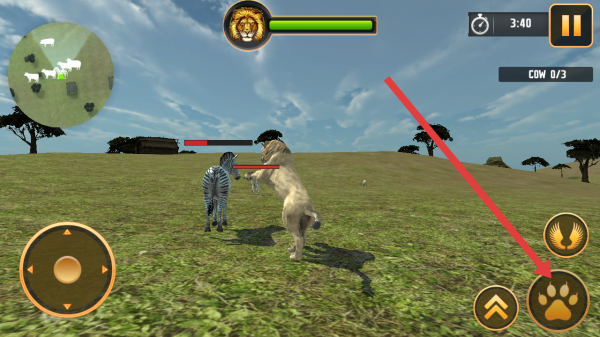 2、在遭遇斑马等其他动物时,需要点击右侧爪印的图标,开始发动攻击的技能,尽快击败它们防止它们逃跑。