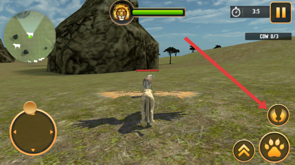 3、点击右侧翅膀图标,让狮子展开翅膀飞行,可以无视地形,快速接近目标牛,留意右上角计时器。