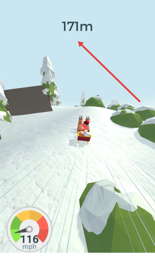 2、在游戏过程中,需灵活操控角色驾驶雪橇,在雪地场景中前行,同时留意上方显示的距离数值。