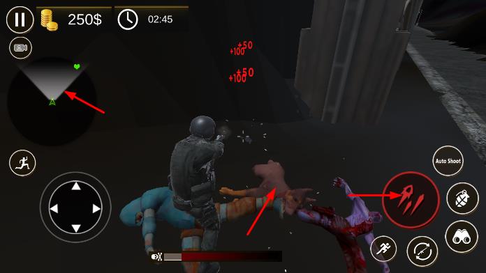 2、战斗中,操控角色在场景移动,利用虚拟摇杆控制方向,点击攻击按钮射击僵尸,注意躲避僵尸攻击,同时可使用技能辅助战斗。