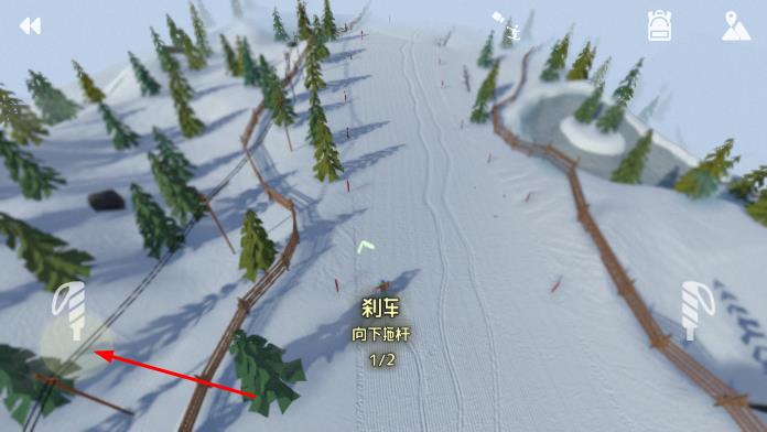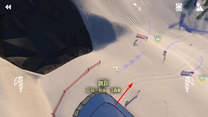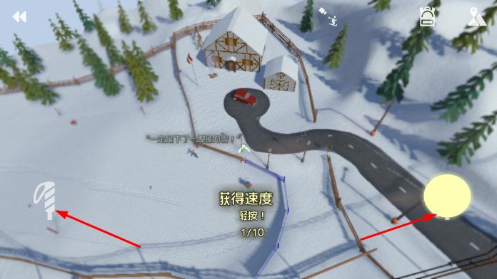 1、进入游戏,在雪山场景中,根据提示轻按屏幕相应位置,让角色在滑雪赛道上获取速度开始滑行。
