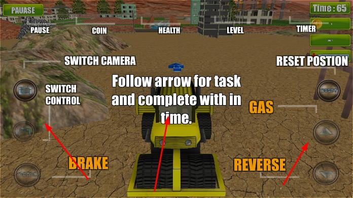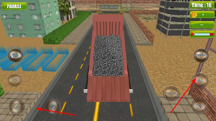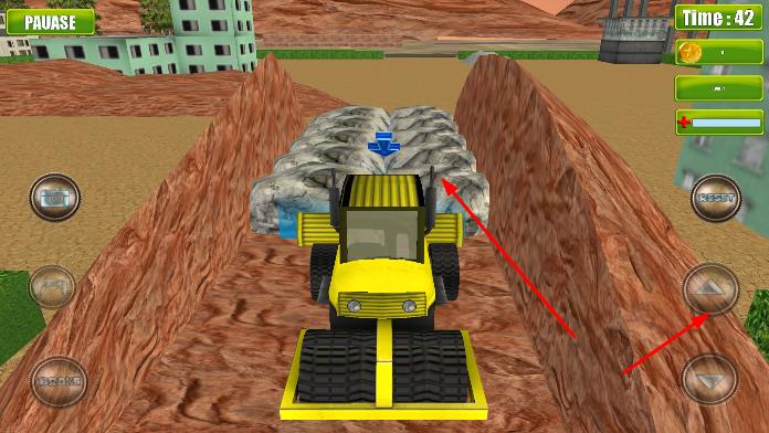 2、操作工程车辆,利用虚拟按键控制移动、转向,在施工场地运输建筑材料,按照建设要求行驶,注意躲避障碍,平稳运输。