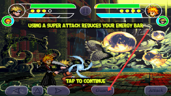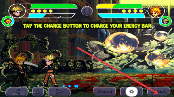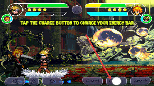 3、战斗时需要留意屏幕上方的能量条,通过点击Charge按钮来充电,增加能量条的数值,可以使用超级攻击。