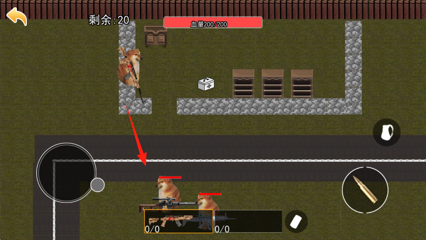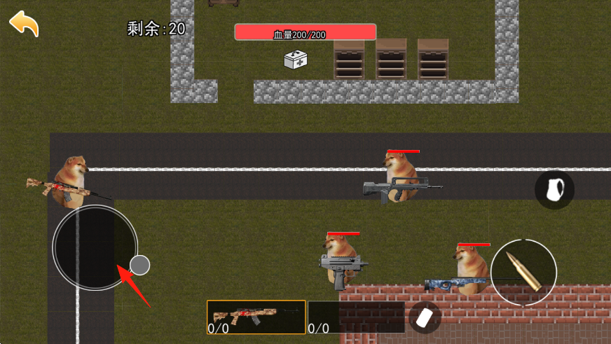 1、以柴犬为形象的战斗角色,持不同枪械,场景含建筑、道路、草丛,界面有血量、剩余敌人、武器栏、虚拟摇杆。