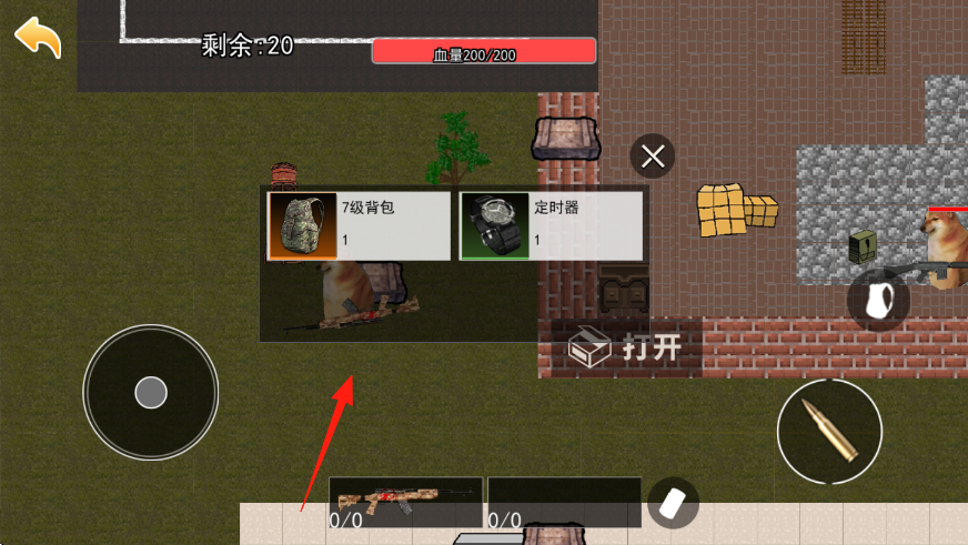 2、操控柴犬角色在场景移动通过摇杆,击败敌人,可拾取物资如7级背包、定时器,属于生存射击、收集养成类玩法。