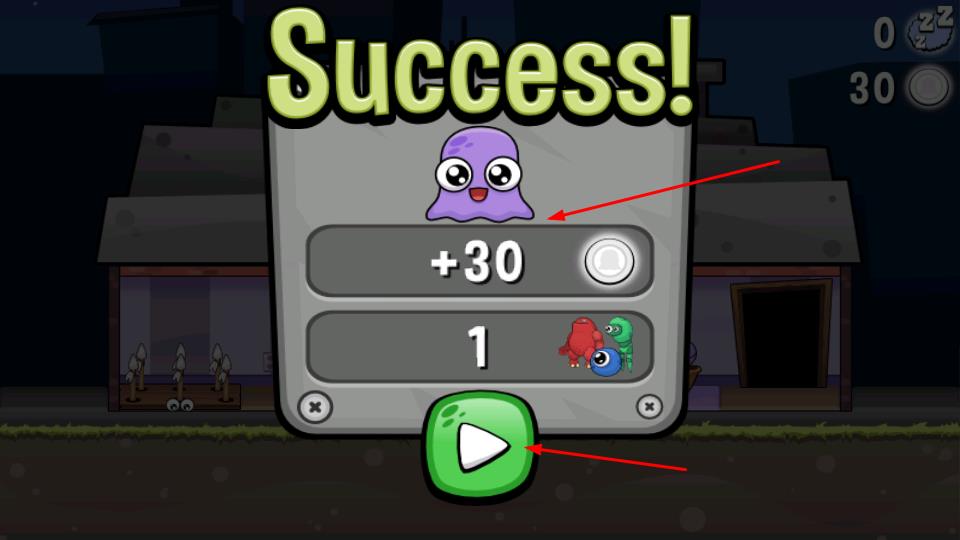 3、完成操作达成目标后,看到Success!提示,获取奖励,点击绿色播放按钮继续游戏进程。