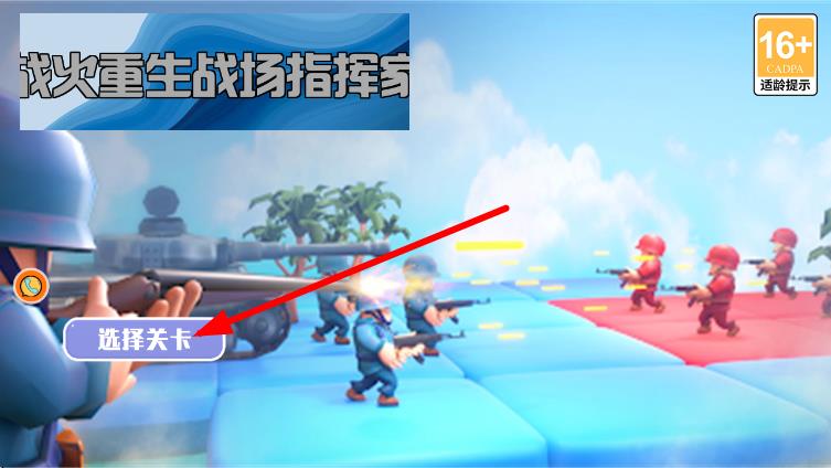 1、在战火重生战场指挥家主界面,点击箭头指向选择关卡,进入关卡选择页,准备战斗。