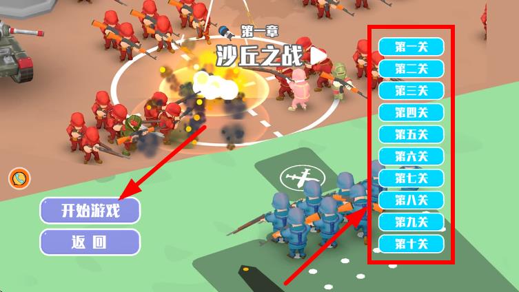 2、关卡选择页我们选择第一章沙丘之战的关卡,点击开始游戏,部署蓝色部队迎击红色敌人。