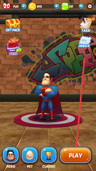 1、在主界面通过点击屏幕下方橙色PLAY按钮,进入跑酷场景,开启英雄的城市跑酷挑战。