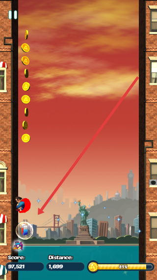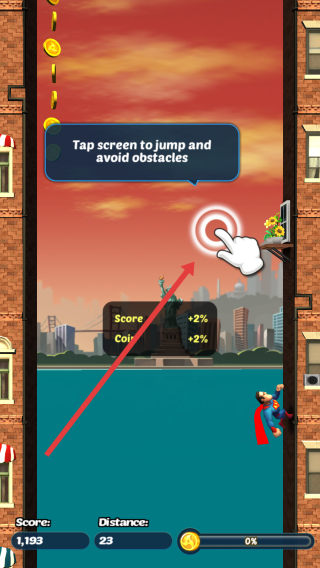 2、进入跑酷后,依据提示Tap-screen-to-jump-and-avoid-obstacles,点击屏幕让英雄跳跃,躲避障碍向前跑。