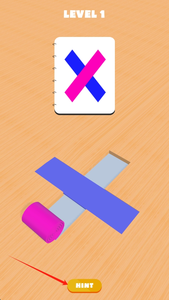 1、在游戏第一关界面,跟随箭头提示,点击HINT,获取涂色提示,开启绘图冒险,点击铺平。
