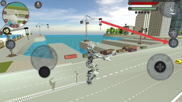 2、需要操控机器人行至码头缺口处,点击右侧跳跃的按键,让机器人跃过障碍继续前进。