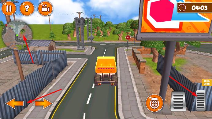 2、操控卡车,利用虚拟按键,控制移动、转向,在城市道路场景行驶,按照地图指引前往目标地点。
