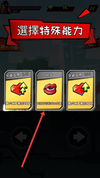 3、击败敌人后,在特殊能力选择界面,可通过点击选择吸血等技能,按需求选后继续战斗冒险。