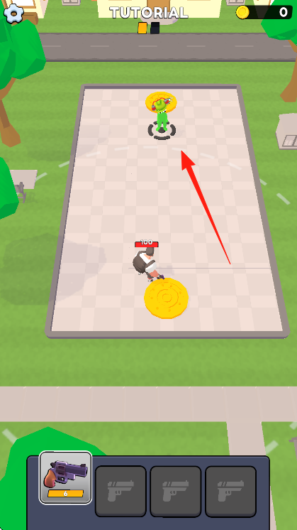 1、进入游戏场景,需操控角色朝着画面中红色箭头指向的绿色敌人移动,利用虚拟摇杆或点击操作,靠近目标,准备展开攻击。
