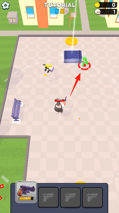 2、在场景里留意红色箭头标记的绿色敌人位置,操控角色灵活移动,避开场景干扰元素,逐步靠近箭头所指敌人,运用武器攻击。