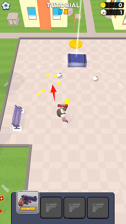 3、红色箭头指向金币区域,操控角色向箭头方向行进,沿途拾取金币,注意移动路径,顺利收集金币。