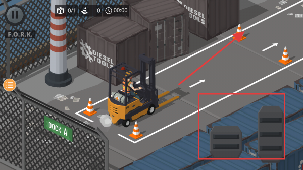 2、在叉车驾驶游戏场景中,操控叉车向红色方框内的货物区域移动,准备进行货物搬运操作。