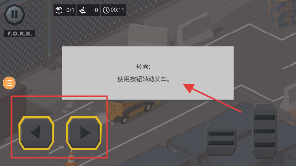 3、在游戏提示界面,根据提示使用左侧红色方框内的方向按钮转动叉车,完成叉车的转向操作。